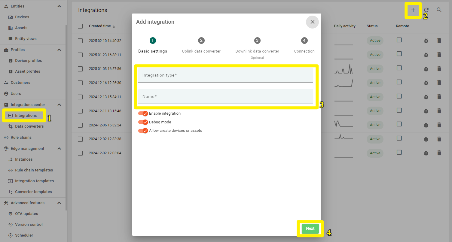 - Navigate to the “Integration center” section, then to the “Integrations” page. Click the “plus” button to add a new integration. Select the type “Chirpstack” and click “Next”.