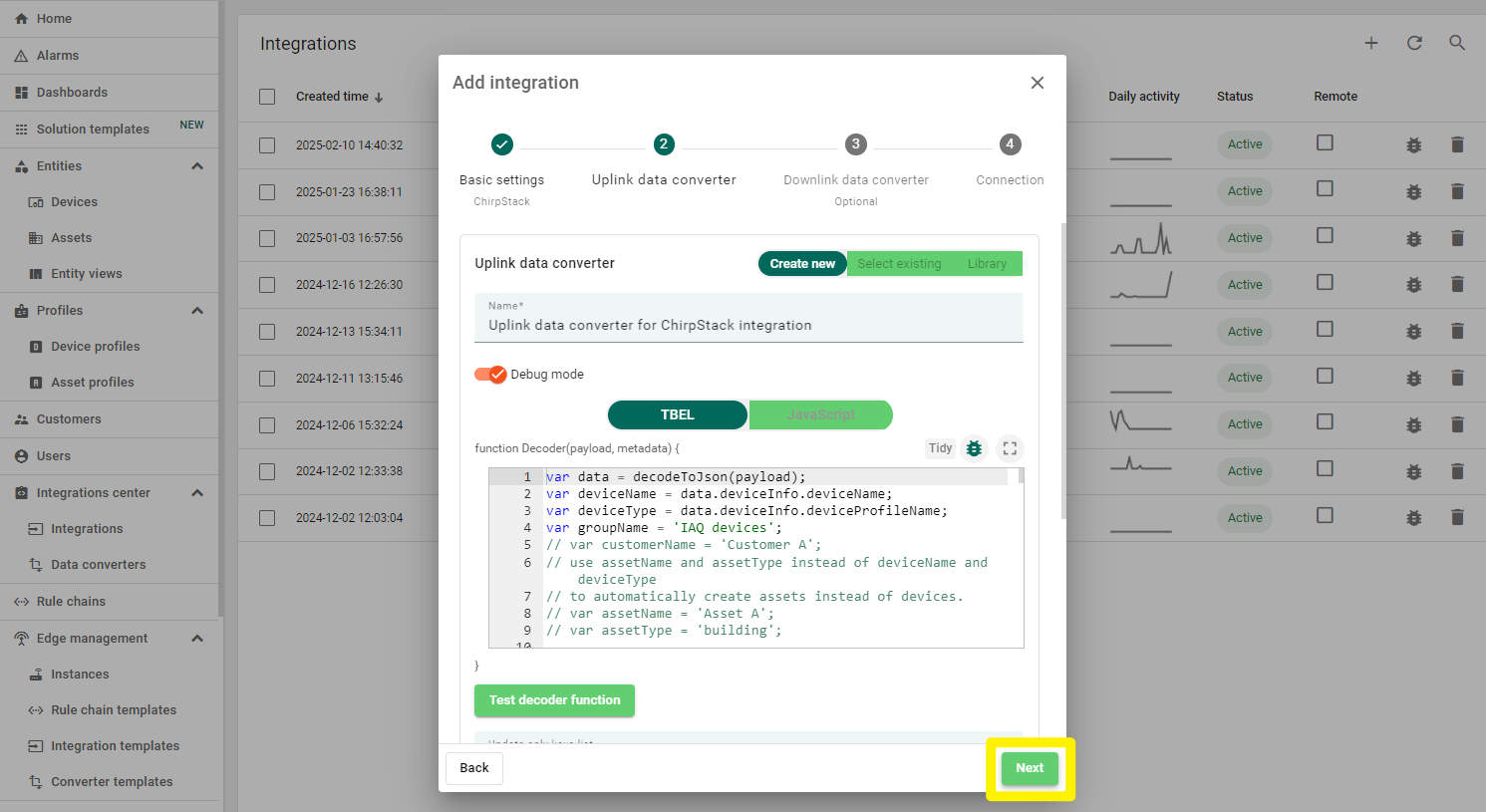- Leave the “Downlink data converter” field empty and click the “Skip” button.