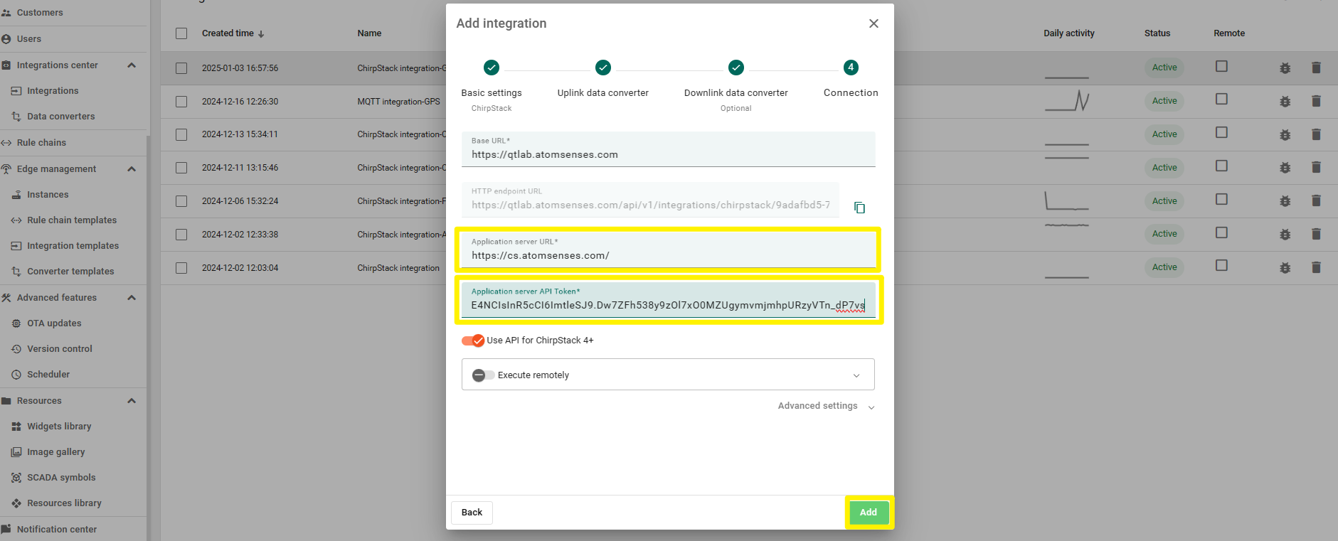 - Enter your “Application server URL” and “API Key” from Chirpstack, copy the “HTTP endpoint URL”, and click the “Add” button.