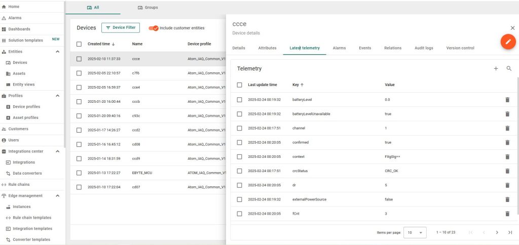 After adding devices, by sending data from the device, it will appear on the corresponding device page in ThingsBoard. You can view the data in the "Entities" -> "Devices" menu or by creating a dashboard