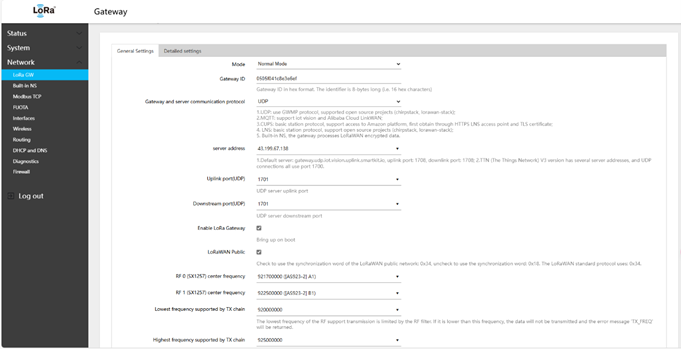 - Log in to the gateway's WEB configuration interface. Navigate to "Network" → "LoRa GW" → "Configuration" to reach the LoRa setting interface.
