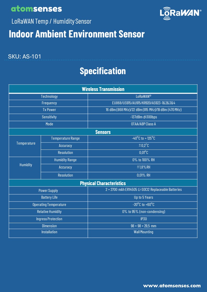 The Atomsenses AS-101 Temperature & Humidity Sensor is a highly accurate and competitively priced LoRaWAN sensor.