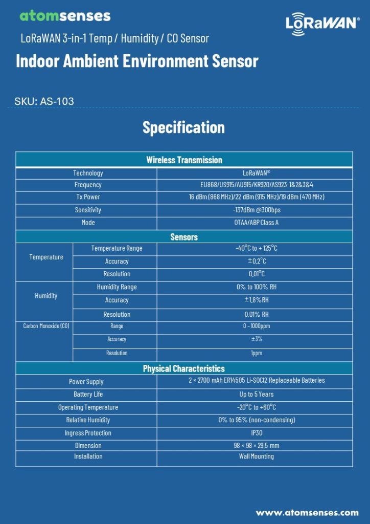 The Atomsenses AS-103 CO Sensor is a highly accurate and competitively priced LoRaWAN sensor.