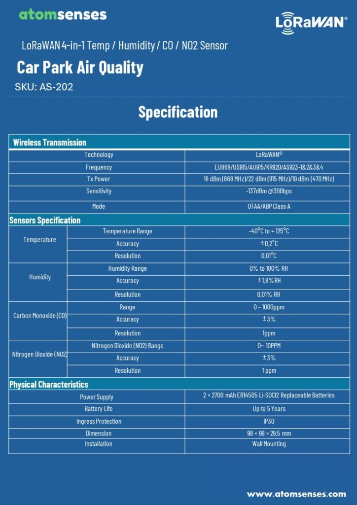 The Atomsenses AS-202 is a LoRaWAN electrochemical-type gas (NO2) detecting sensor with a high sensitivity to low concentrations of detected gas, high selectivity, and a stable baseline. Perfect for Car Park