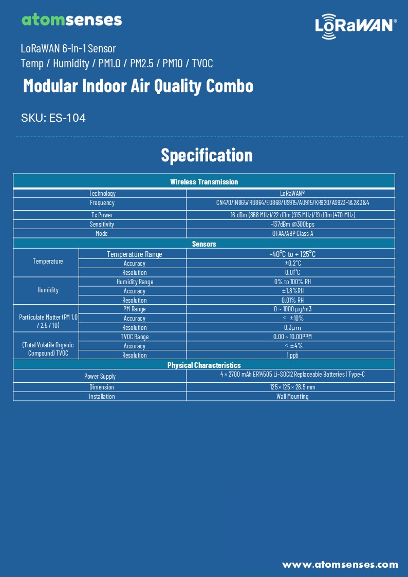 The Atomsenses ES-104 is a LoRaWAN electrochemical-type gas detecting sensor with a high sensitivity to low concentrations of detected gas, high selectivity, and a stable baseline.