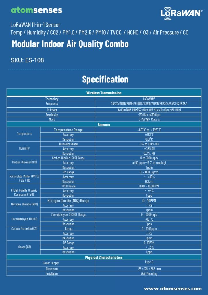 The Atomsenses ES-108 is designed to be integrated multi-purpose, comprehensive indoor air quality sensor for detecting CO2 concentration, Temperature, Humidity, PM1.0, PM2.5, PM10, TVOC, HCHO, O3, Air Pressure, CO accurately and economically